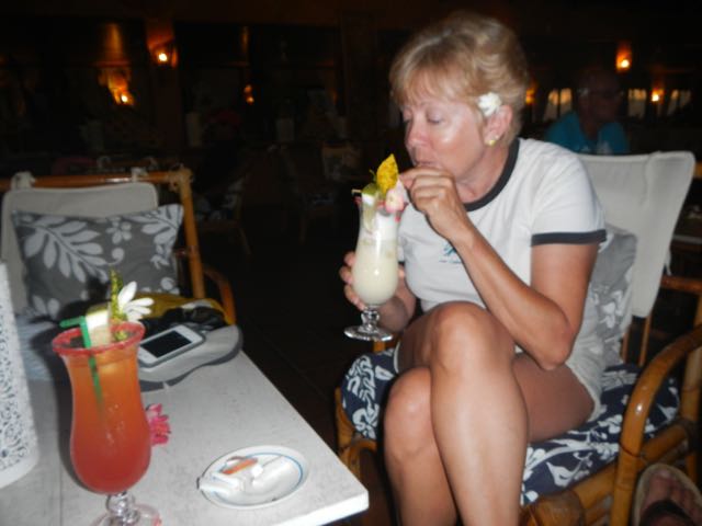 We try to support any business that supports boaters, so after our walk, we strolled into the Relais Mahana's bar, each consuming a large Hinano on tap. We stayed so long that we were able to transition to Happy Hour! As usual, I ordered a MaiTai and Conni had a Chichi.