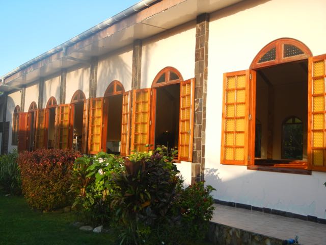 A view of the side garden of the church, with all of the shutters wide open. There is no glass in the windows, but the shutters can be closed in inclement weather.
