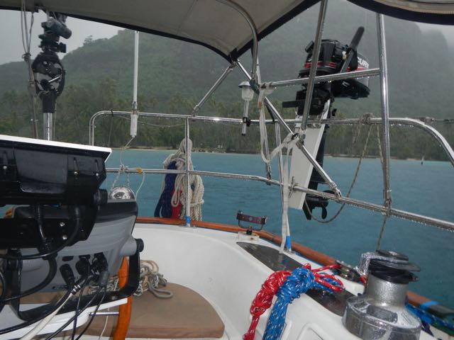 On arrival in Opunohu Bay on Moorea, we snapped this photo of the cockpit. The wonderful Mercury sits on its stand, the instruments, at left, are covered from sun damage, and the odd antenna at the stern is our Wifi enhancer. Even if we can't quite reach a Wifi service with our laptops, this powered system will pull it in. I connect to it via that Ethernet cable and then use my laptop's Wifi to share the signal. The small solar powered rail lights (there's another at the other corner) give us some cockpit light and also make it much easier to find Wings in a crowded anchorage.