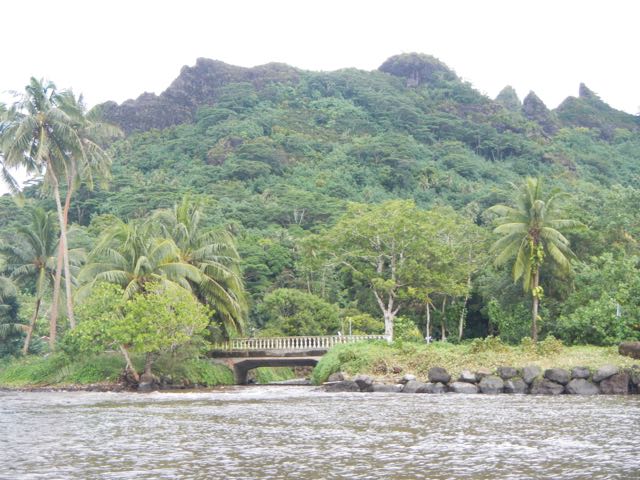 I shot this photo of this typical and beautiful French Polynesian bridge. We've seen them all over the country. They're concrete but with these lovely molded ballustrades. The river was turning the immediate water an opaque brick-red.