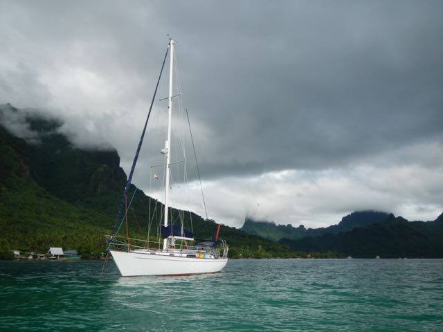 Beautiful Wings lies to her anchor in Opunohu Bay.