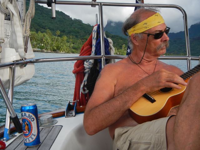 Not entirely staged, but the Hinano was placed there! Here's Bill, patiently strumming his uke. One day, you'll recognize a tune! |