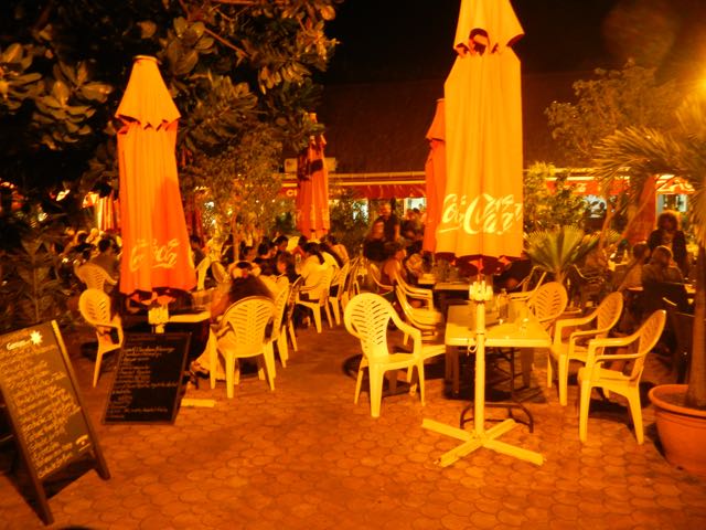 We mentioned the sidewalk cafes in the waterfront park. Here they are - about 5 of them in a row, and they all share this outdoor table space for customers. They're open from about 11:00 AM - 1:30 PM for lunch, then again from 6 PM onward for dinner. We had a fine meal of Tahitian/Chinese food. By the time we left about 8:30, there wasn't an empty table in sight. The sodium lights they used for illumination colored the photo.