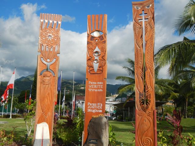 50 years ago, 2 July 1966, the French conducted their first atomic bomb test detonation on Mururoa, an atoll in the southern Tuamotus in French Polynesia. Many nuclear tests were conducted there - Mururoa Atoll was for them what Bikini Atoll was to the U.S. - remote and far away and therefore seemingly "expendable." The Polynesian people, as you might imagine, feel differently. As a culture, they've become extremely anti-nuclear, as you can imagine. Mururoa and Fangataufa atolls and the area around them are still off-limits to cruising sailors. This lovely memorial commemorates the 2 June 1966 nuclear event. This memorial is just outside the gate to our dock, so we've seen it every day.