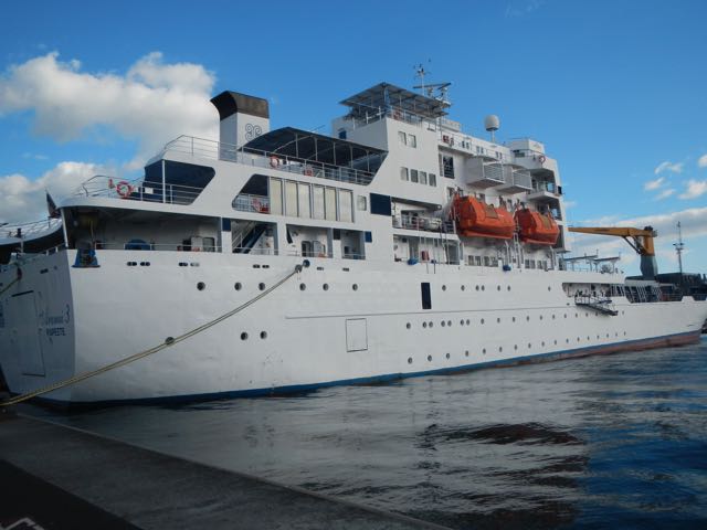 This odd vessel is the M/V Arenui. It's half cargo (towards the bow at the right) and half passenger ferry. It voyages inter-island to some of the more distant islands of French Polynesia, while the various Aremiti ferries shuttle back and forth between Tahiti and Moorea.