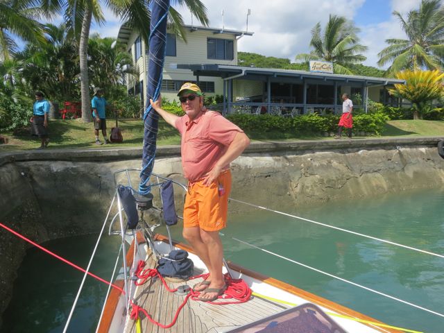 Wings at the dock in Fiji, preparing to leave. We use the main sheet, a horizontal line below the boom, as a clothes line for drying towels and such. S/V Laudromat!