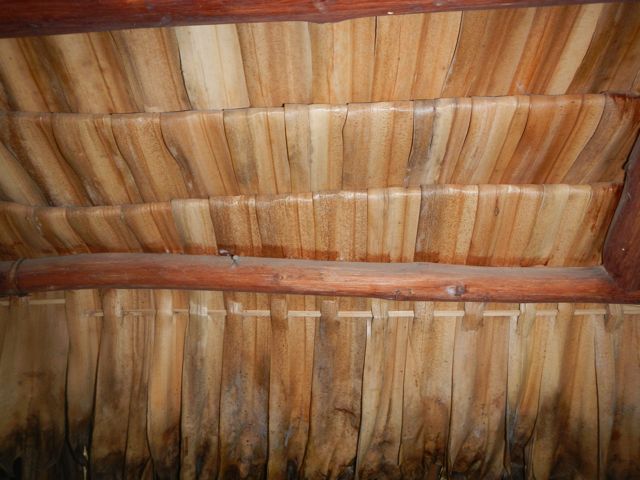 We sheltered from downpours on our walk in this thatched hut. I took the opportunity to photograph the construction. Note the stand that ties the bottom of the bottom layer.