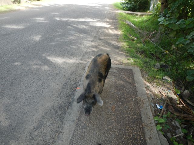 Road hog? As is common in the Pacific, pigs roam wild, but someone knows whose they are.