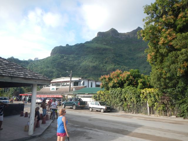 Lovely Conni strides along a pathway at the head of Faanui Bay, the local Catholic Church in the background. We're still not sure if the pathway is natural or human-made.