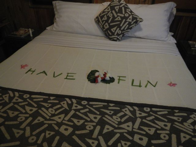 The last bed message from our housekeepers. How nice it that? Each afternoon, we returned to our bure and found little notes like this.
